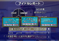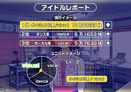 アイドルレポートをもとに、プロデュース方針を決めて下さいね。TVで歌うときに着るステージ衣装の変更、リリースする曲の変更ができるんですよ。 |